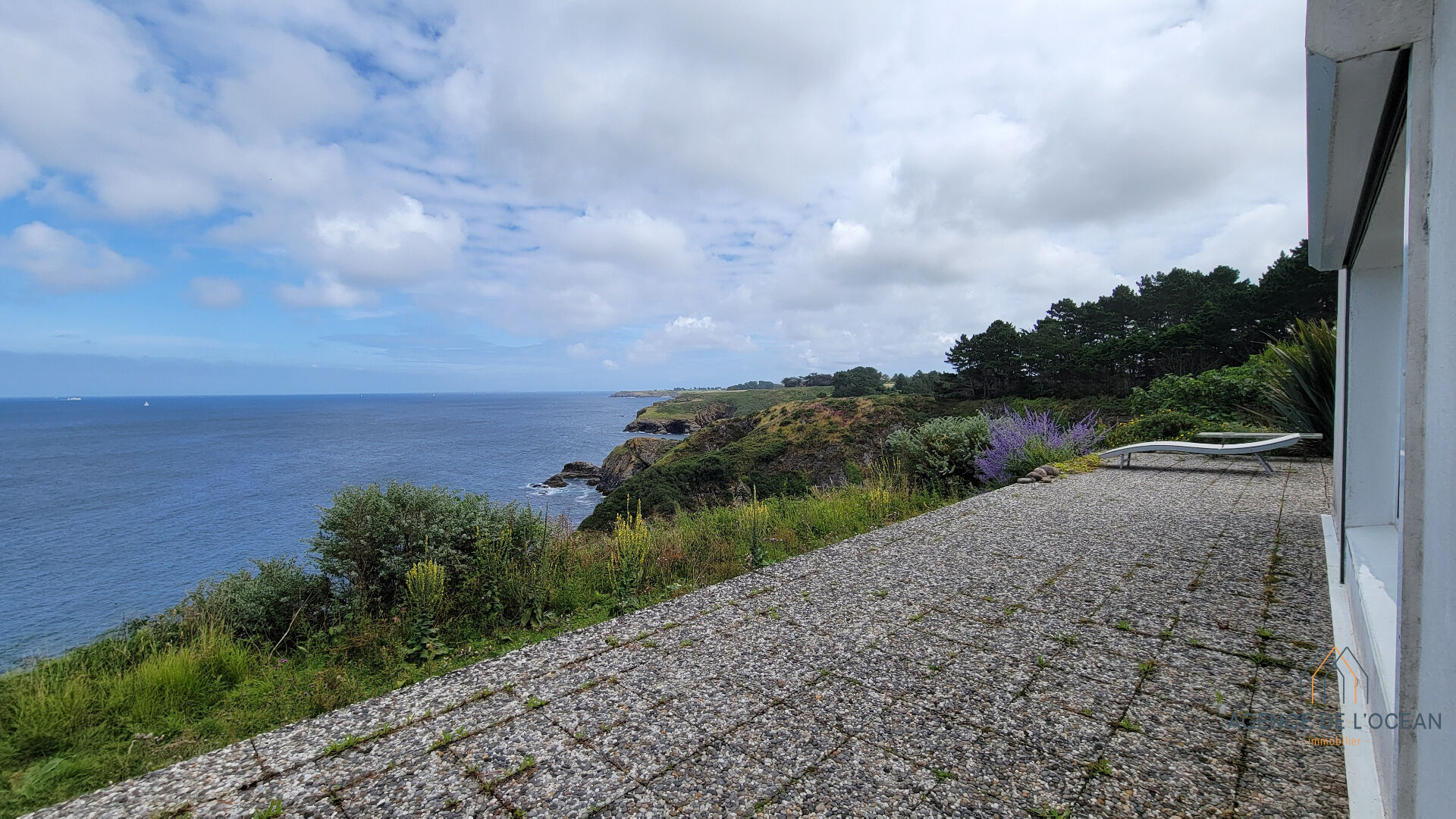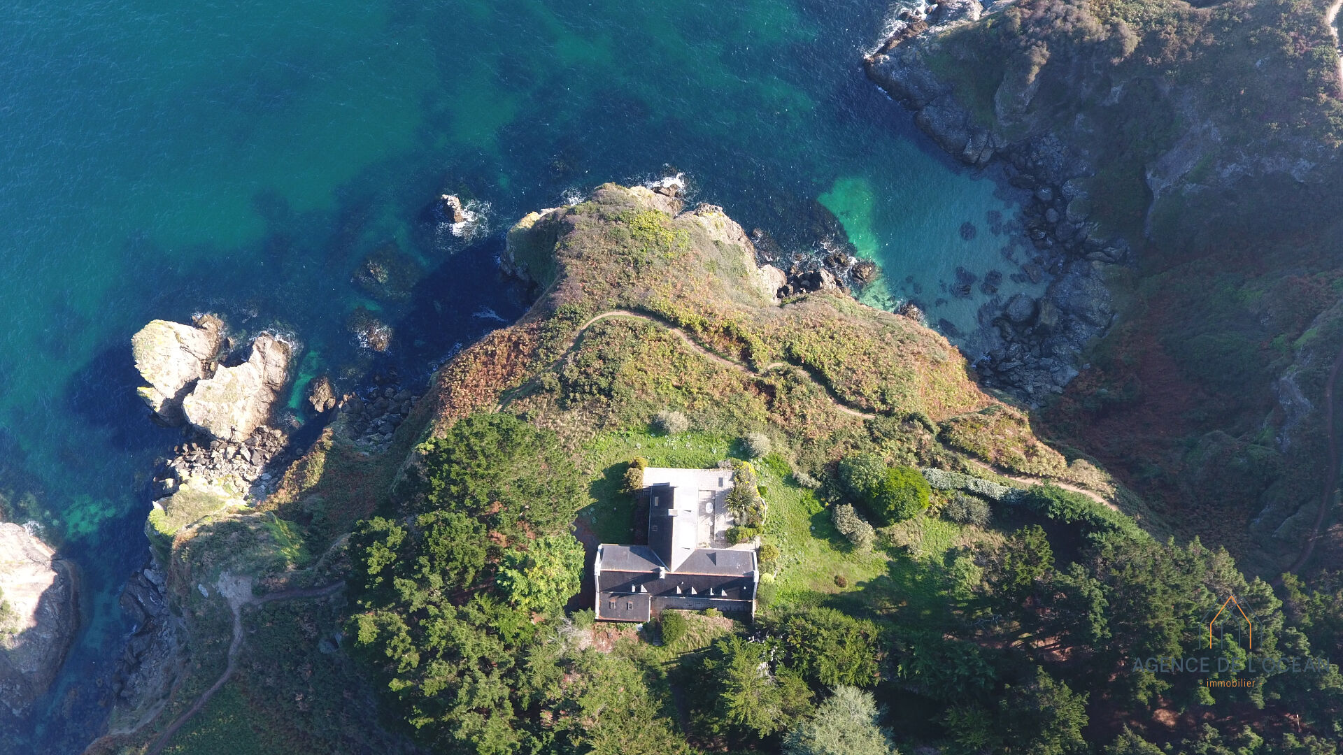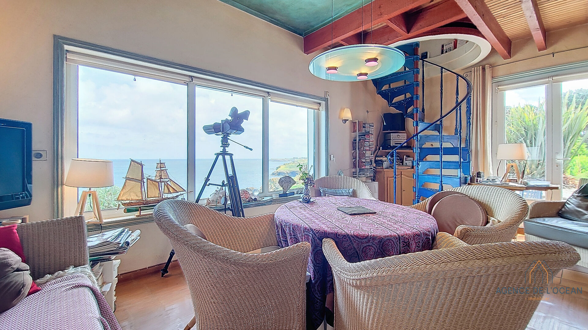 En surplomb de la côte intérieure de Belle-Île-en-Mer, sur un terrain de plus de 6 ha, grande maison faisant face à la presqu'île et la baie de Quiberon. La maison, construite sur 2 niveaux au début des années 70, se situe tout au bout d'un chemin qui mène à une crique et au sentier côtier. La maison comprend, au rez de chaussée, une entrée, un séjour-salle à manger avec vue sur la mer, une cuisine indépendante, une chambre avec vue sur la mer, un bureau avec vue sur mer, une salle d'eau et un WC. A l'étage, un large palier dessert quatre chambres, toutes avec une vue sur la mer, une salle d'eau et un WC indépendant. Une dernière chambre avec sa salle de bains est accessible depuis le salon. Le jardin longe la côte d'une plage à une autre et comprend un sous-bois dans lequel une petite dépendance peut être réhabilitée en habitation. Au delà de la vue exceptionnelle, les accès privilégiés à deux plages depuis la propriété rendent cette maison quasiment unique sur la région. Belle-Île-en-Mer est accessible en bateau depuis Quiberon ou Vannes ou par les airs via l'aérodrome de Bangor (piste de 600 M) qui se situe au milieu de l'ile ( à 6 km de la propriété). (6.00 % honoraires TTC à la charge de l'acquéreur.)