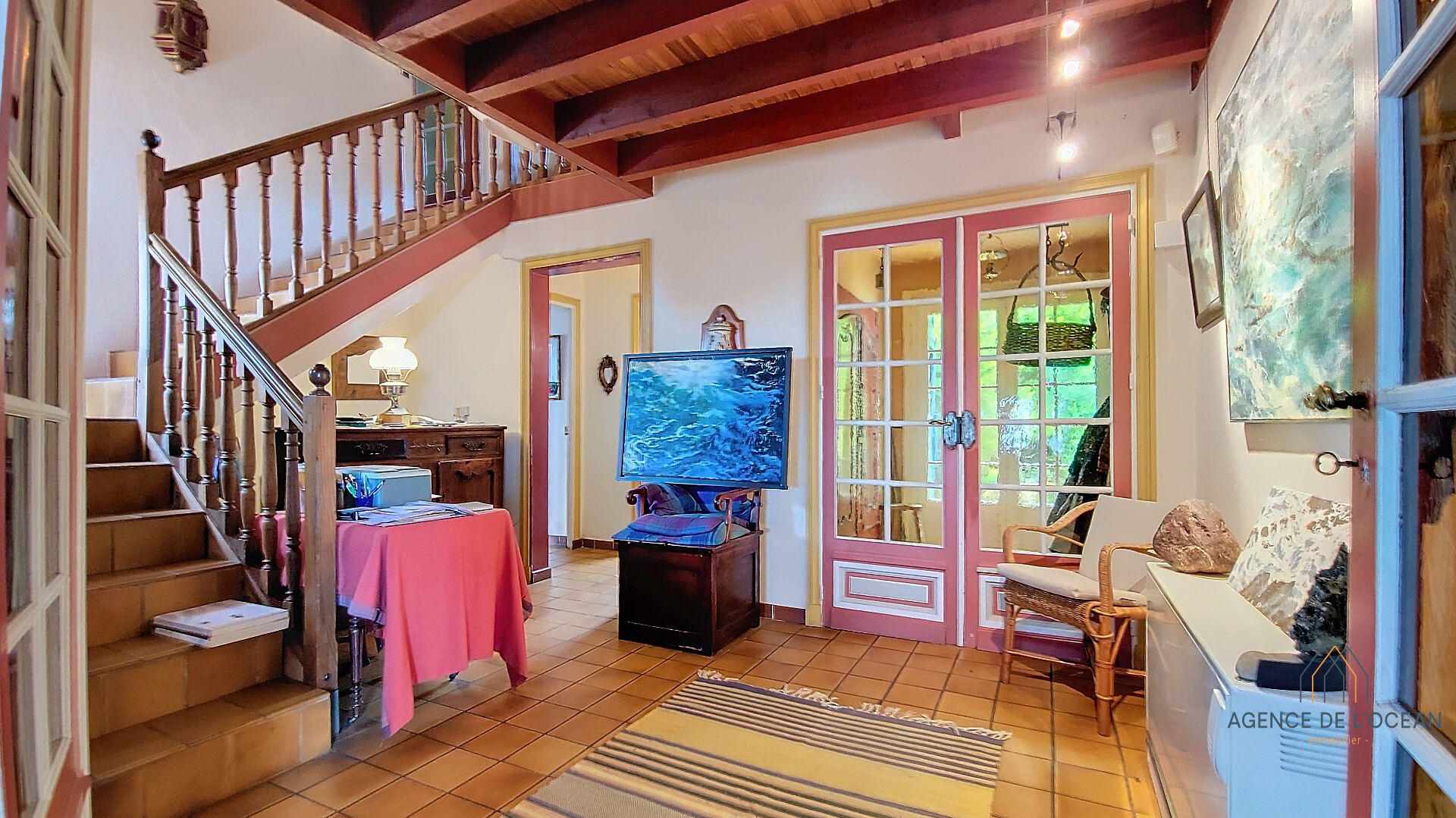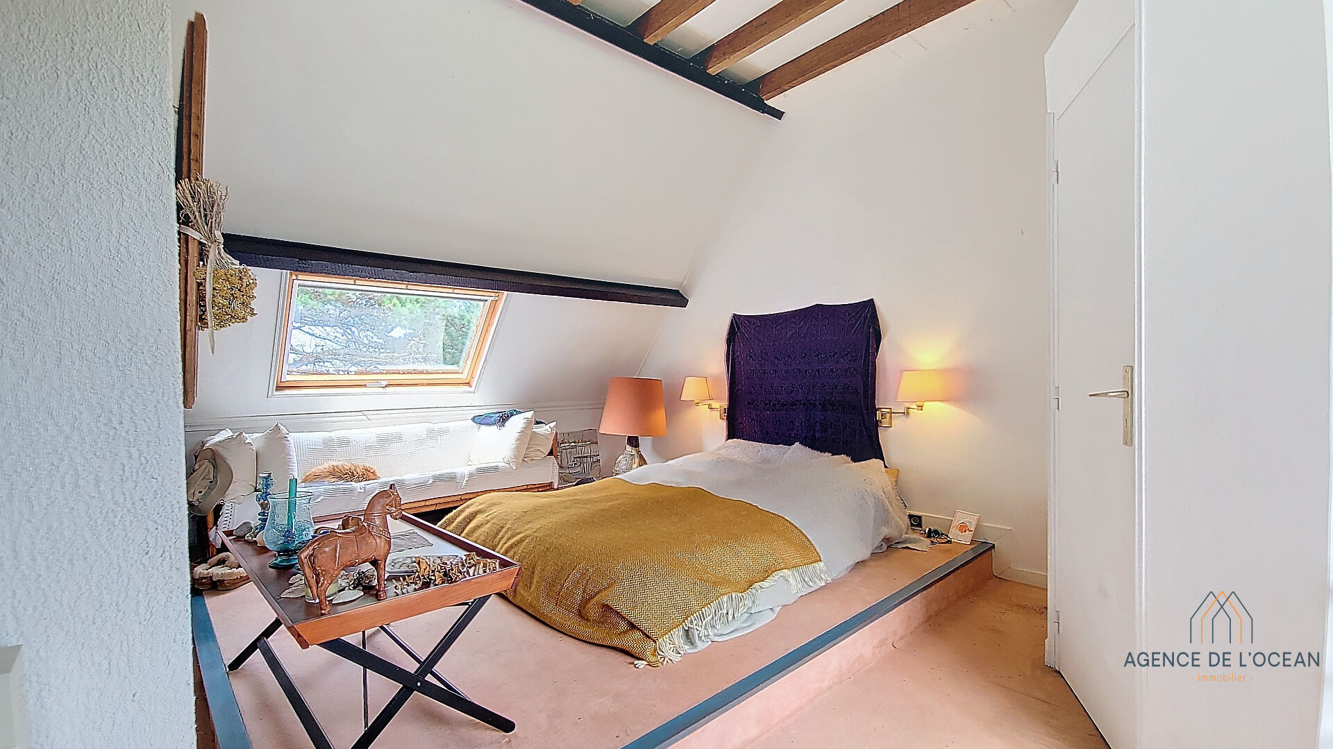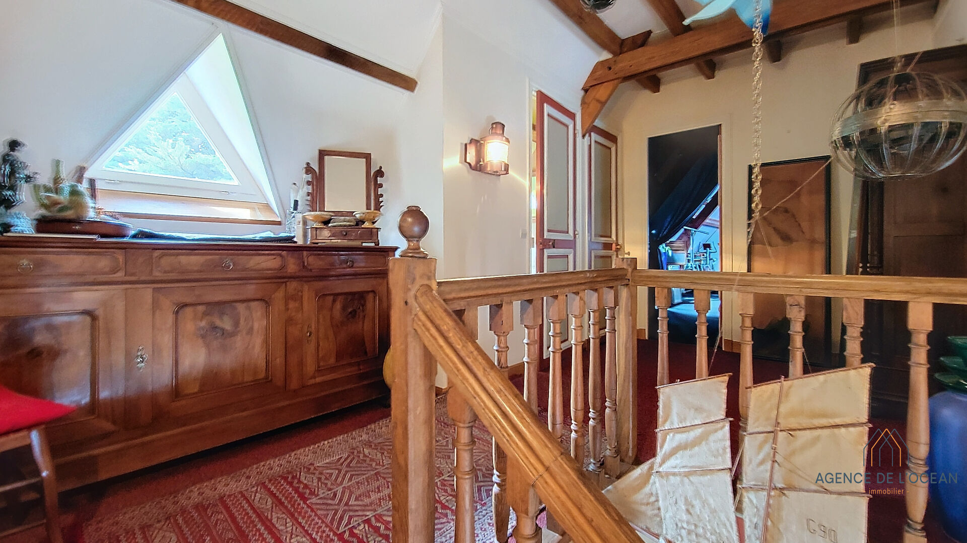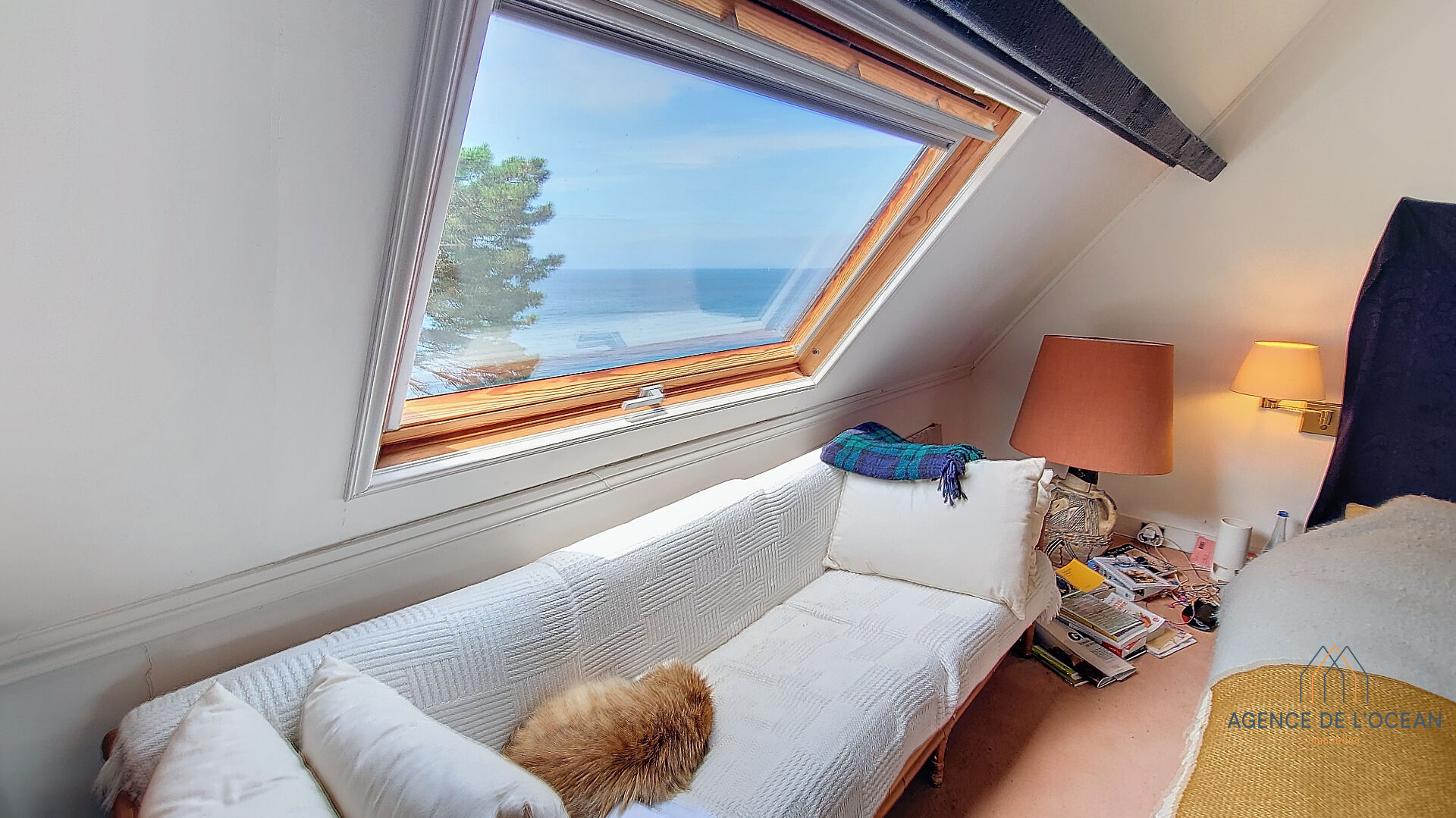 En surplomb de la côte intérieure de Belle-Île-en-Mer, sur un terrain de plus de 6 ha, grande maison faisant face à la presqu'île et la baie de Quiberon. La maison, construite sur 2 niveaux au début des années 70, se situe tout au bout d'un chemin qui mène à une crique et au sentier côtier. La maison comprend, au rez de chaussée, une entrée, un séjour-salle à manger avec vue sur la mer, une cuisine indépendante, une chambre avec vue sur la mer, un bureau avec vue sur mer, une salle d'eau et un WC. A l'étage, un large palier dessert quatre chambres, toutes avec une vue sur la mer, une salle d'eau et un WC indépendant. Une dernière chambre avec sa salle de bains est accessible depuis le salon. Le jardin longe la côte d'une plage à une autre et comprend un sous-bois dans lequel une petite dépendance peut être réhabilitée en habitation. Au delà de la vue exceptionnelle, les accès privilégiés à deux plages depuis la propriété rendent cette maison quasiment unique sur la région. Belle-Île-en-Mer est accessible en bateau depuis Quiberon ou Vannes ou par les airs via l'aérodrome de Bangor (piste de 600 M) qui se situe au milieu de l'ile ( à 6 km de la propriété). (6.00 % honoraires TTC à la charge de l'acquéreur.)