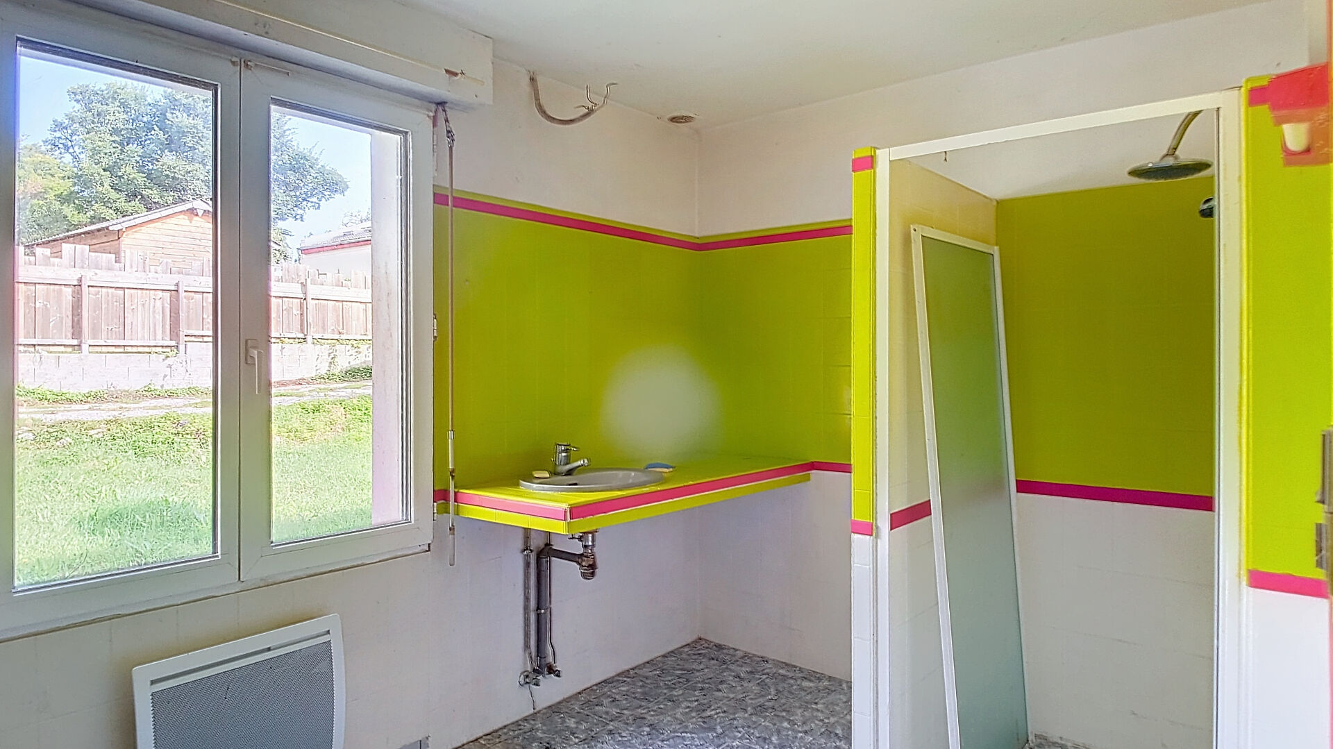Elle est composée au rez-de-chaussée d'un salon - séjour de 45 m², d'une grande cuisine indépendante, d'une chambre, d'une buanderie et d'une salle d'eau/wc.