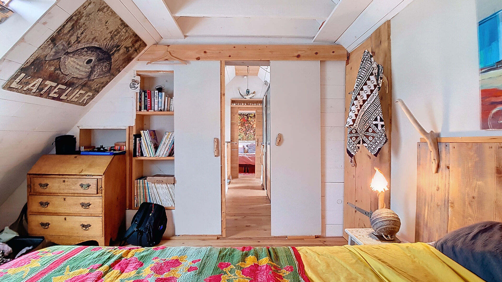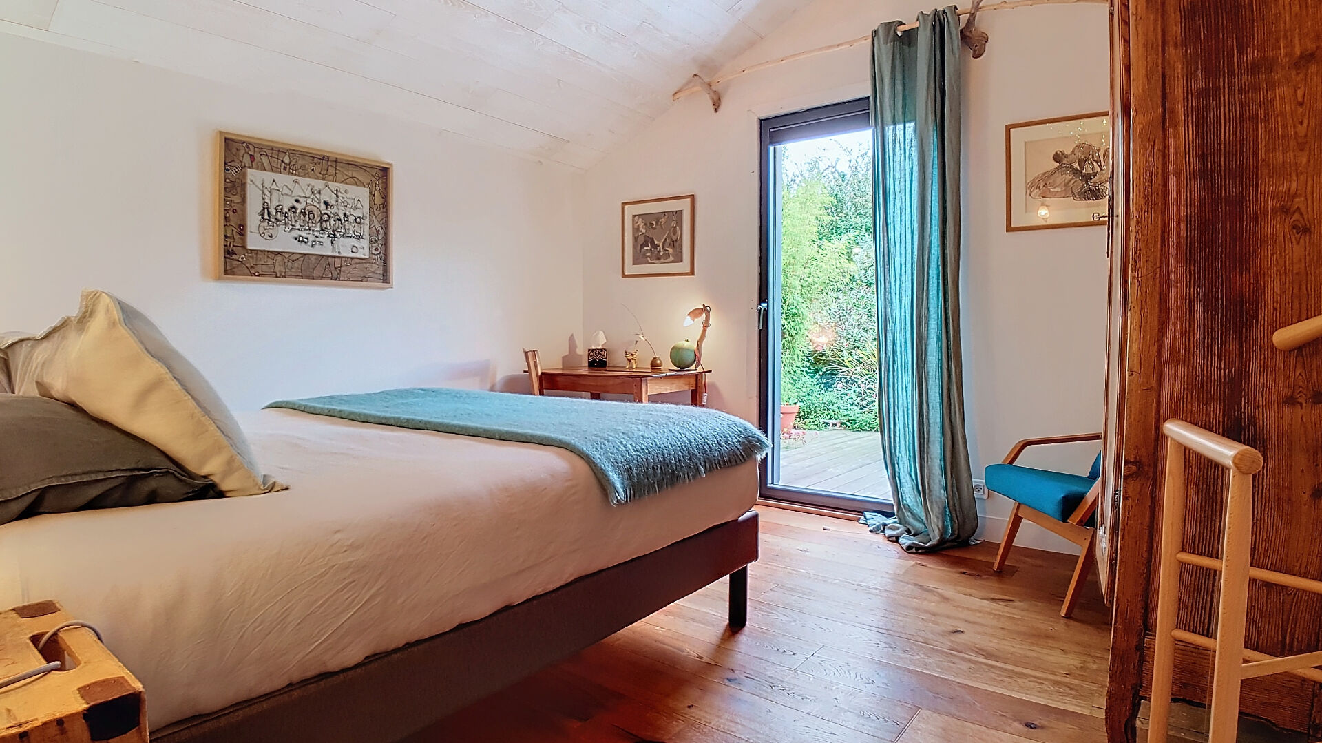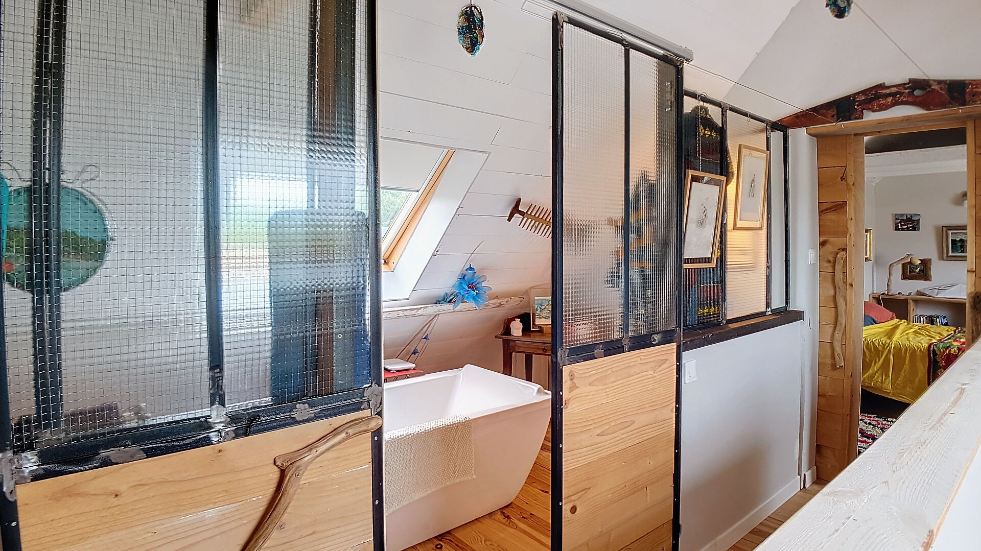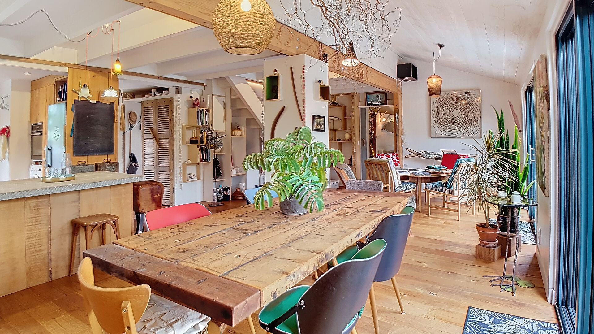 D'une superficie de plus de 200 m², la maison se compose, au rez-de-chaussée, d'une cuisine ouverte moderne, d'une vaste pièce de vie qui s'ouvre sur une terrasse et un jardin, créant un lien harmonieux entre l'intérieur et l'extérieur. Une chambre avec salle d'eau et WC privatifs bénéficie également d'un accès individuel à la terrasse sud. Au nord, deux ateliers de 38m² et 25m² en grande partie vitrés, parfaits pour les artistes ou pour toute activité créative, complètent ce niveau.