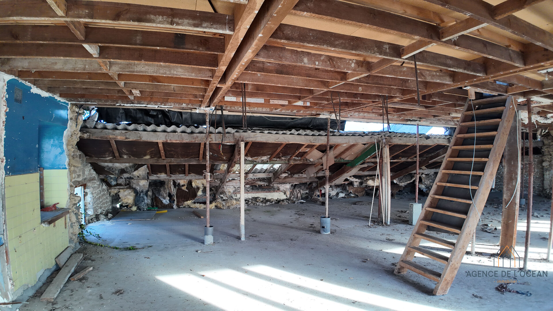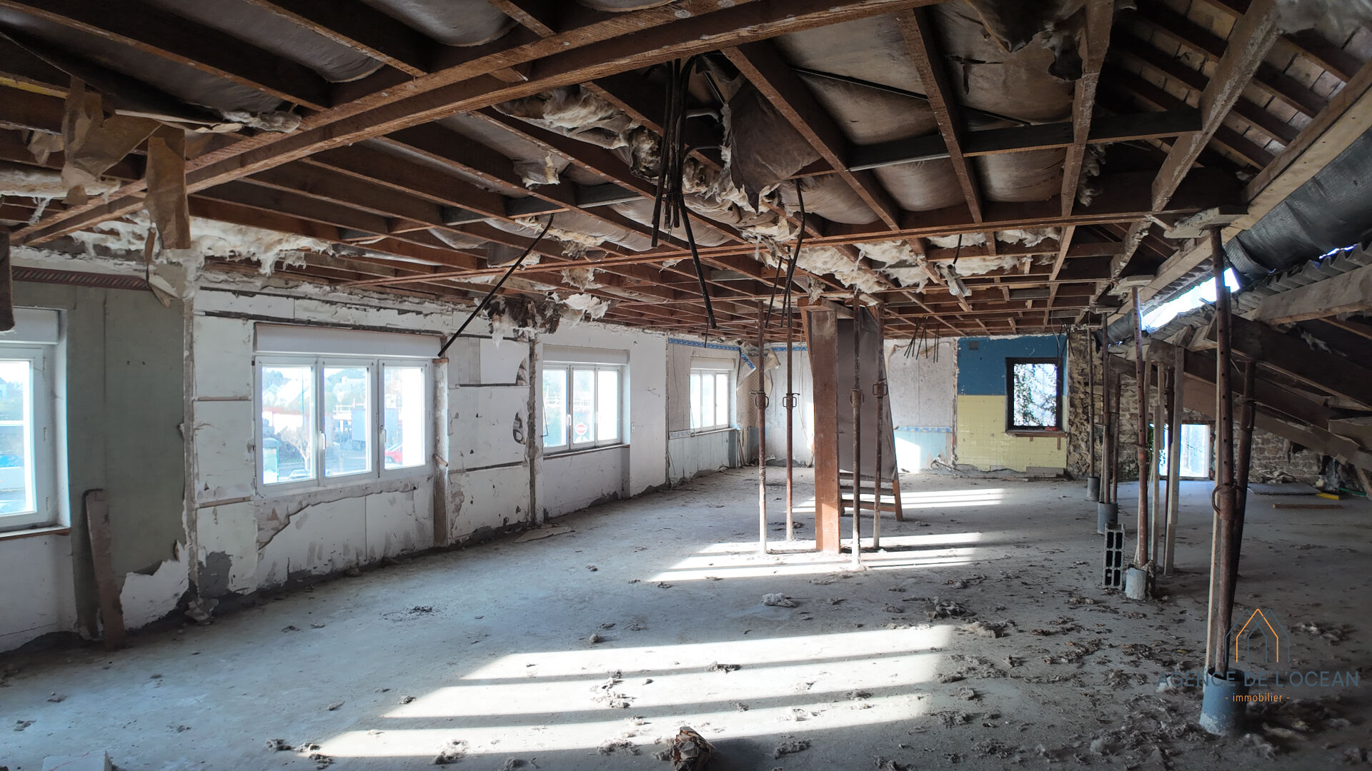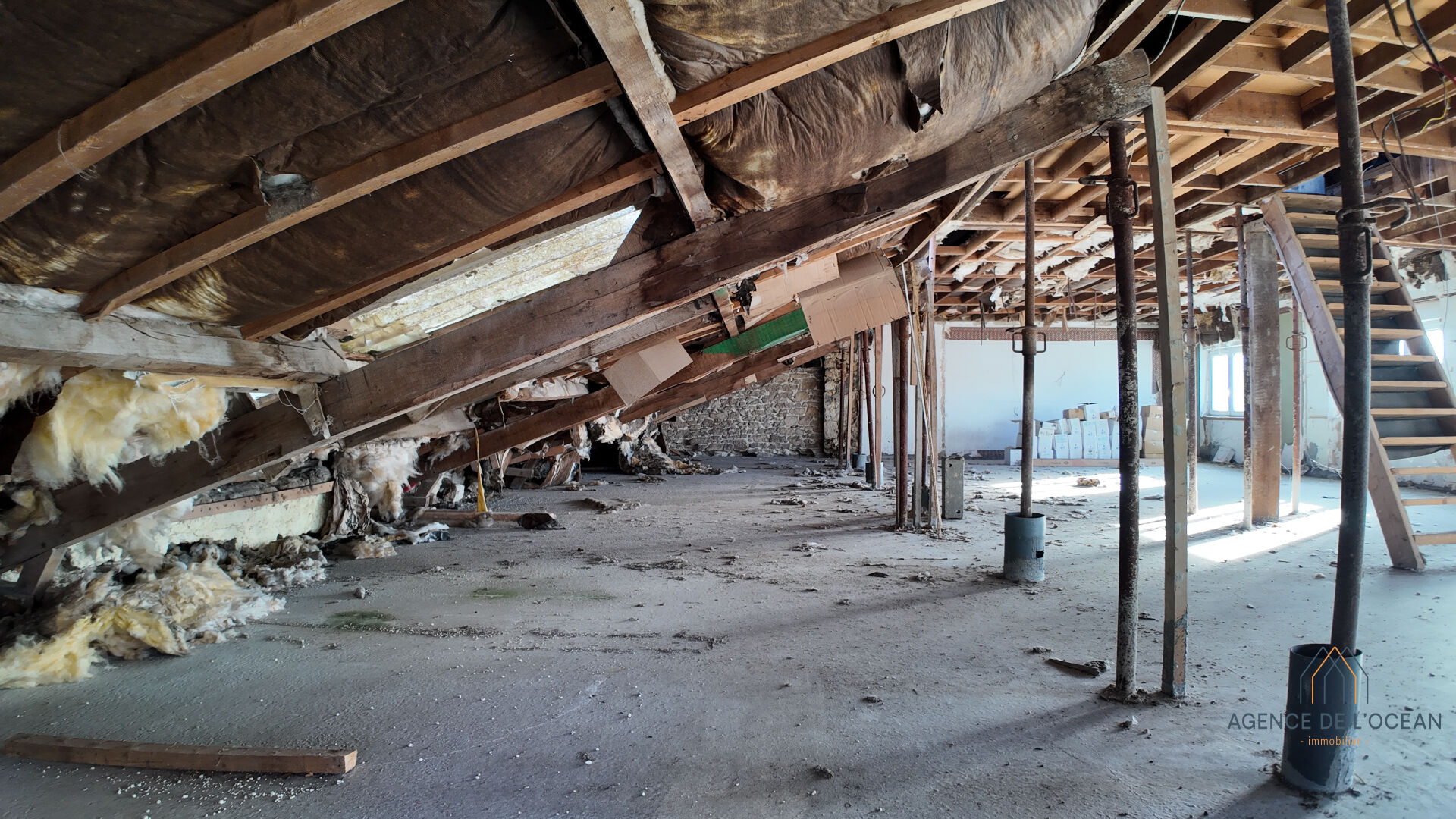 Le local se situe au premier étage d'une ancienne maison en pierre et est isolé des deux commerces du rez de chaussée par une dalle béton .